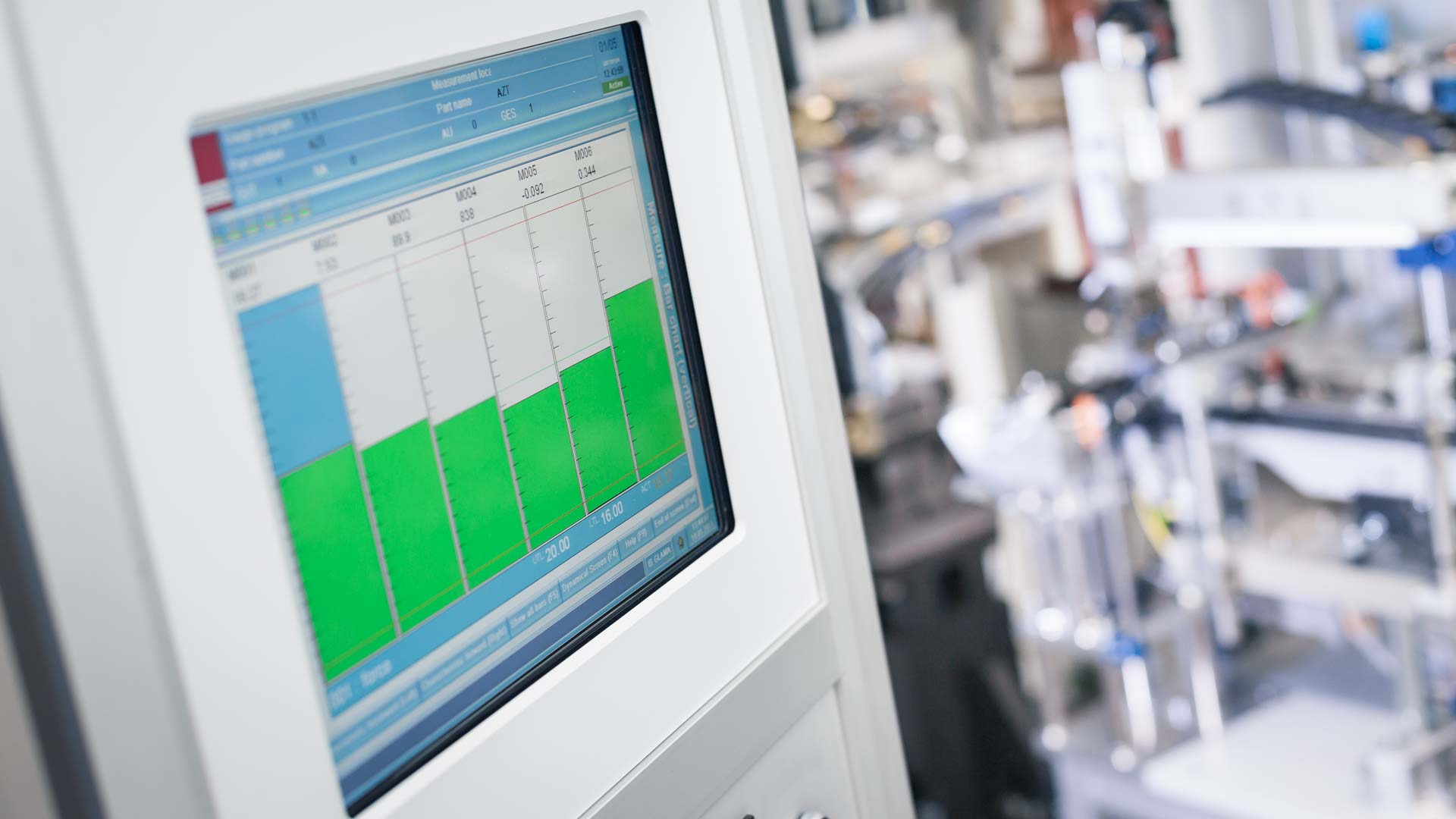Eine mögliche Grunddarstellung für die Produktion ist ein Balkendiagramm. Sämtliche zu prüfenden Merkmale werden in dieser Darstellung angezeigt. Liegen die aufgenommenen Messwerte zwischen den Toleranzgrenzen, erfolgt eine „grün“ Darstellung der Balken. Bei Messwerten außerhalb der Toleranzen sind diese in „rot“ dargestellt. Nachfolgend kann die Maschinensteuerung bei Aktionen, wie z.B. dem Aussortieren von Teilen, ein Warnsignal und/oder einen Anlagenstopp auslösen. Wir bieten ebenfalls die Beschriftung der geschweißten Teile an, um diese auch zu späteren Zeitpunkten einwandfrei zuordnen zu können.